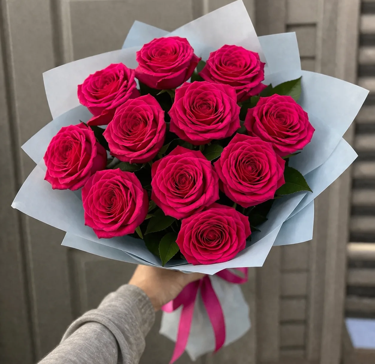 Малиновые розы в упаковке Букет из 11 малиновых роз