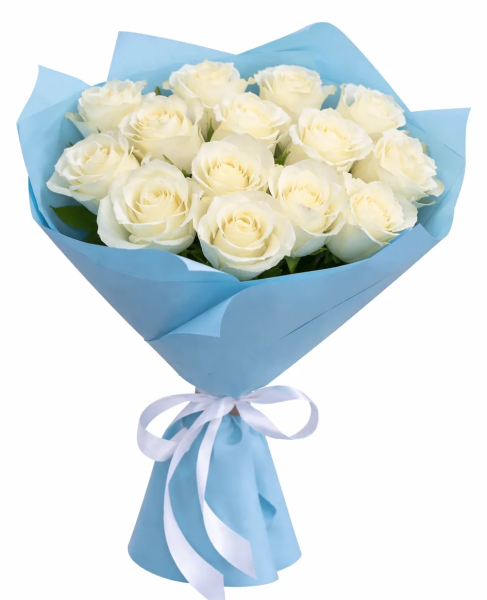 Элегантный букет из 15 белых роз воплощает чистоту, искренность и утончённую красоту. Пышные бутоны создают гармоничную и выразительную композицию, наполненную светом и лёгкостью. Голубая упаковка добавляет свежесть и мягкое настроение, подчёркивая нежность каждого цветка.