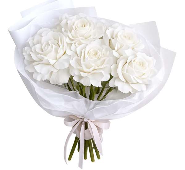 Белая упаковка подчёркивает чистоту оттенков и делает букет особенно элегантным и цельным. Такой букет станет идеальным подарком для выражения искренних чувств, уважения и светлых эмоций