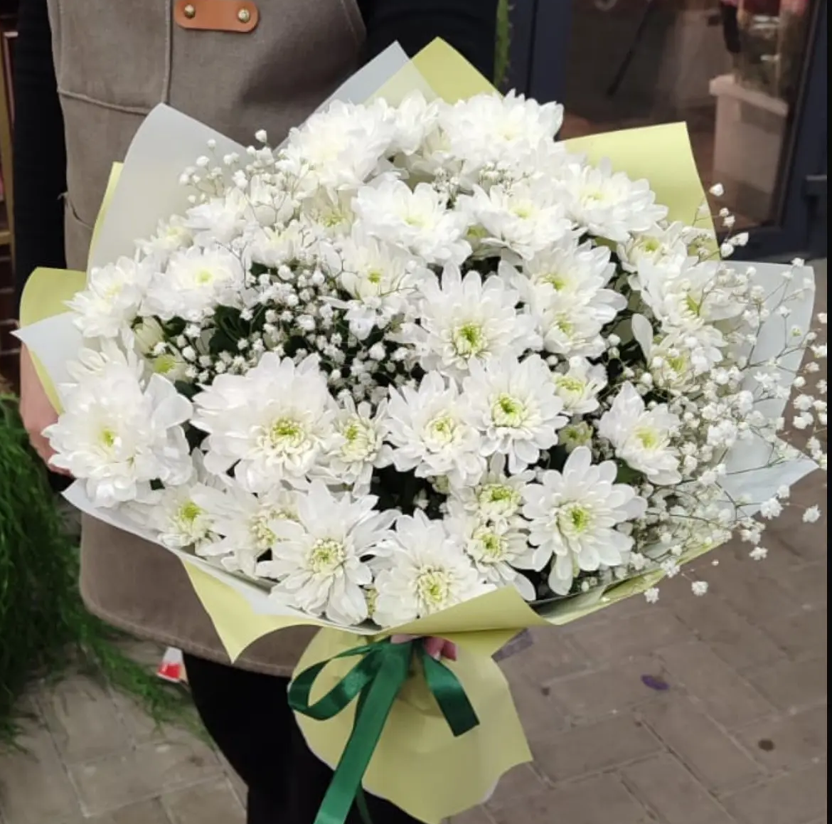 - Стандарт - кустовая хризантема - 5 шт., гипсофила, упаковка, лента