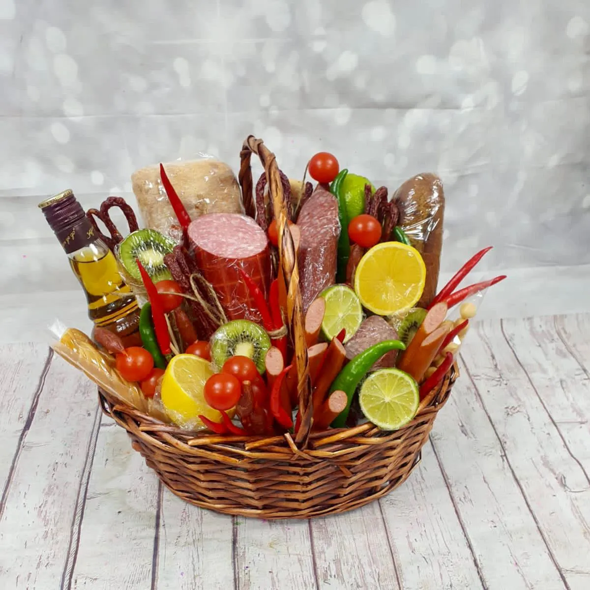 Состав: колбаса, хлеб, сыр, перец, черри, лимоны, киви, колбаски ,корзина.