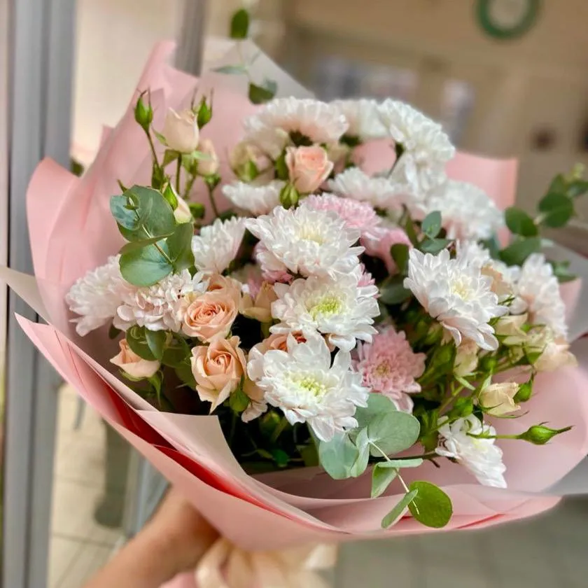 - Средний - кустовая роза - 3 шт., хризантема кустовая - 4 шт., упаковка, лента
