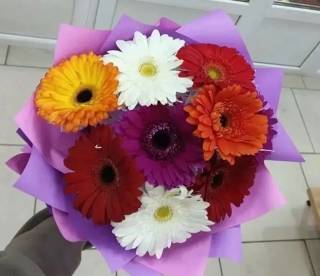 - Премиум - гербера - 9 шт., упаковка, лента