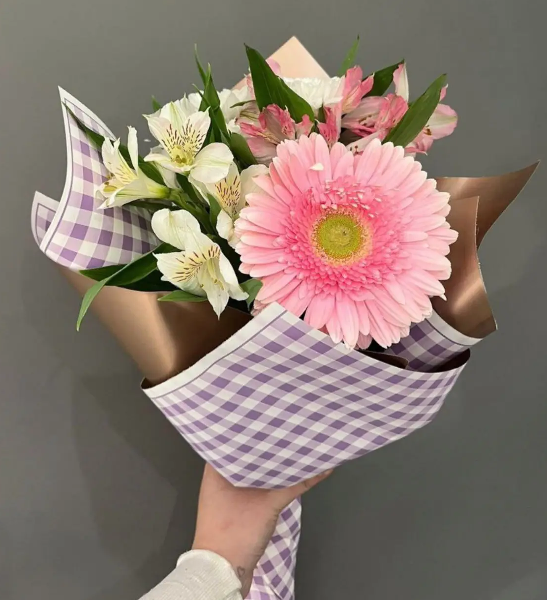 Яркий и нежный букет, в котором розовая гербера становится солнечным акцентом композиции, наполняя её теплом и позитивом. Белая и розовая альстромерия добавляет лёгкость, изящество и создаёт гармоничное сочетание оттенков, делая букет живым и многогранным.