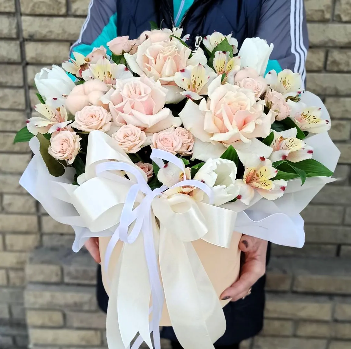 • Стандарт - роза - 3 шт.,альстромерия - 7 шт., кустовая роза - 3 шт., зелень, оазис, шляпная коробка