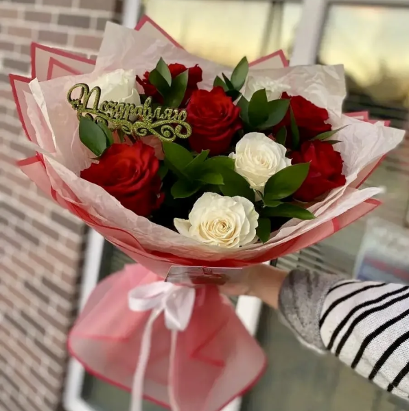Элегантная композиция из красных и белых роз, дополненная праздничным топпером «Поздравляю», станет идеальным подарком для любого торжества. Стильно, ярко и с особым настроением.
