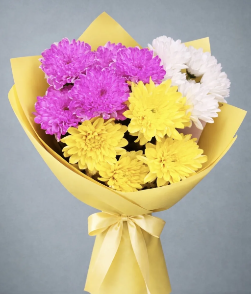 Яркий и жизнерадостный букет, в котором белые, жёлтые и розовые кустовые хризантемы создают гармоничное сочетание нежности и солнечного настроения. Пышные соцветия придают композиции объём и лёгкость, наполняя её теплом и позитивной энергией.