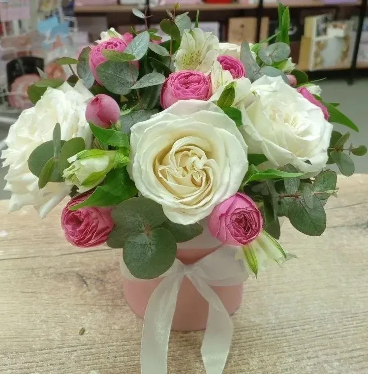 Вся эта нежная палитра цветов собрана в элегантной шляпной коробке, которая придает композиции завершенный, презентабельный вид. Коробка – это не просто упаковка, это стильный аксессуар, который подчеркивает ценность содержимого и делает букет готовым к дарению, не требуя дополнительной вазы.