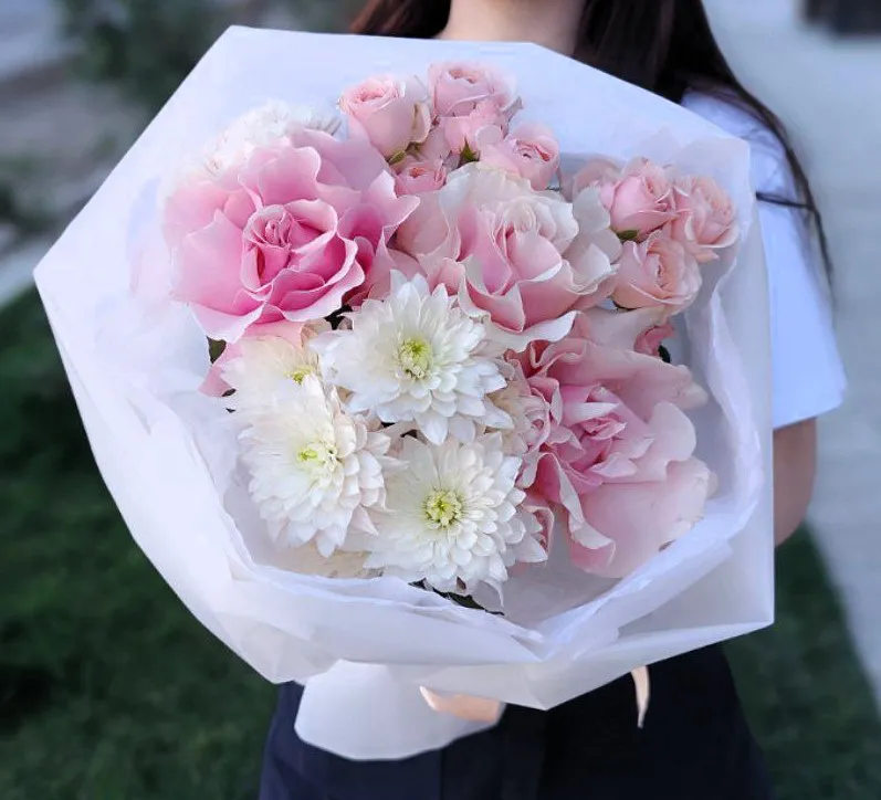 Букет из роз и хризантем Розовый шелк