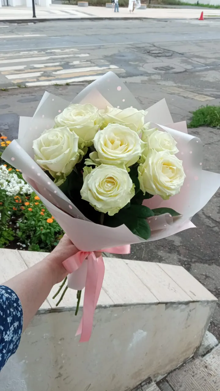 Букет из белых роз — это воплощение нежности и элегантности. Каждое цветок выглядит как маленькое чудо природы, с идеально гладкими лепестками, излучающими мягкий свет. Белые розы символизируют чистоту, невинность и новую любовь, создавая атмосферу умиротворения и гармонии.