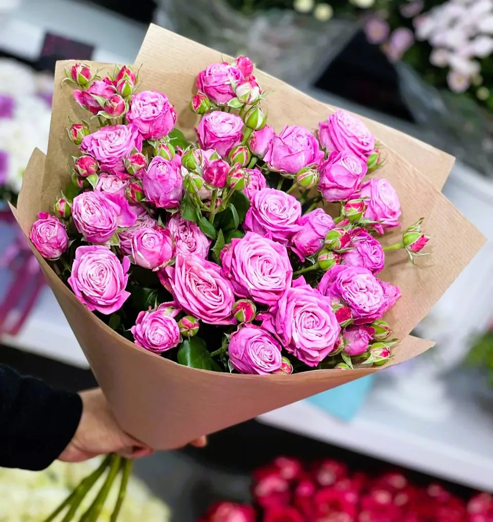 • Средний - кустовая роза - 9 шт ,упаковка,лента
