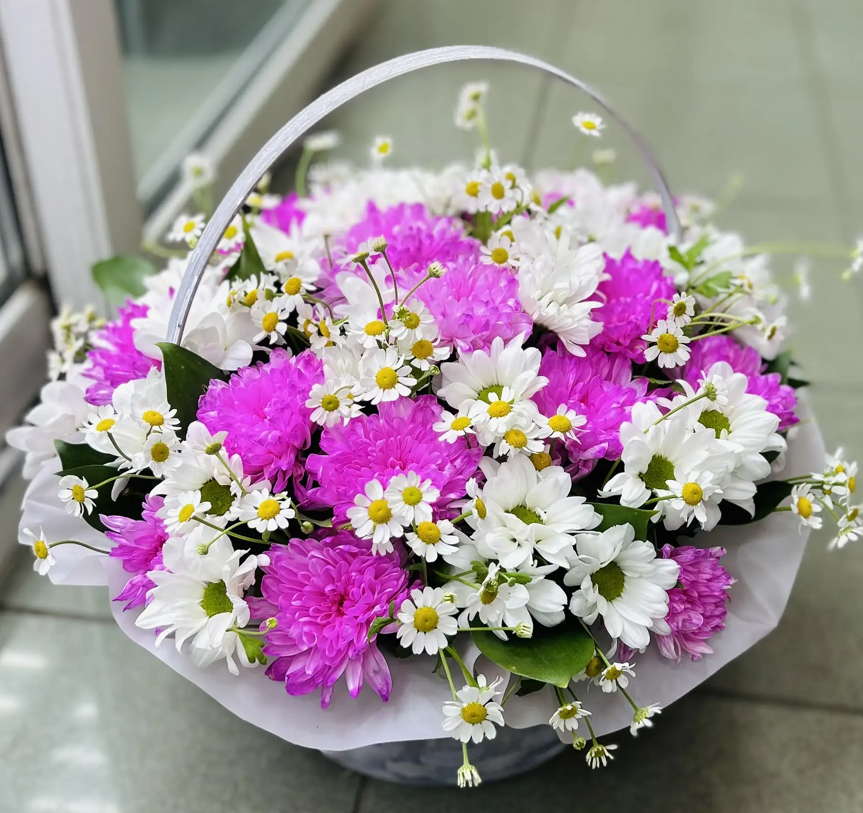 Кустовые хризантемы отличаются своей пышной формой и долгим сроком цветения, что делает их прекрасным выбором для создания ярких композиций. В сочетании с белыми и розовыми оттенками, такая корзина привносит в интерьер свежесть и изящество.